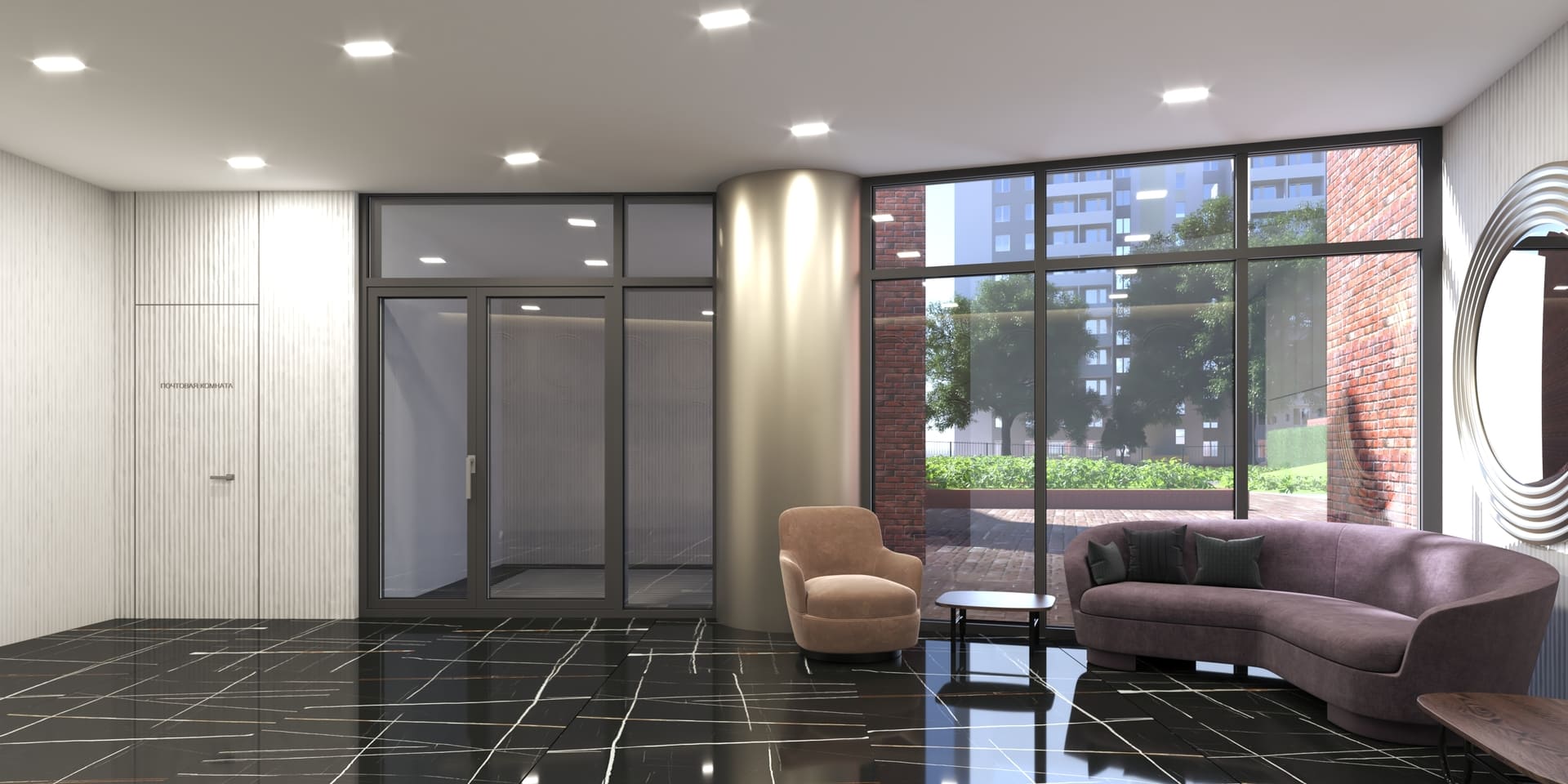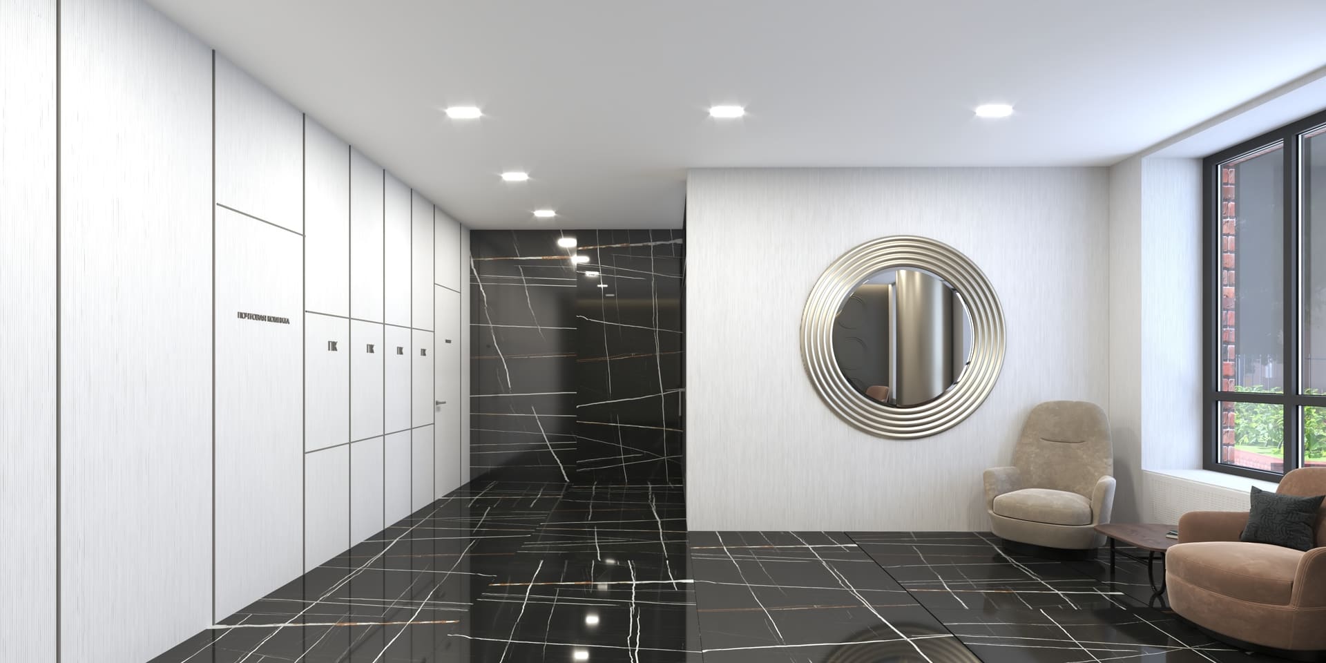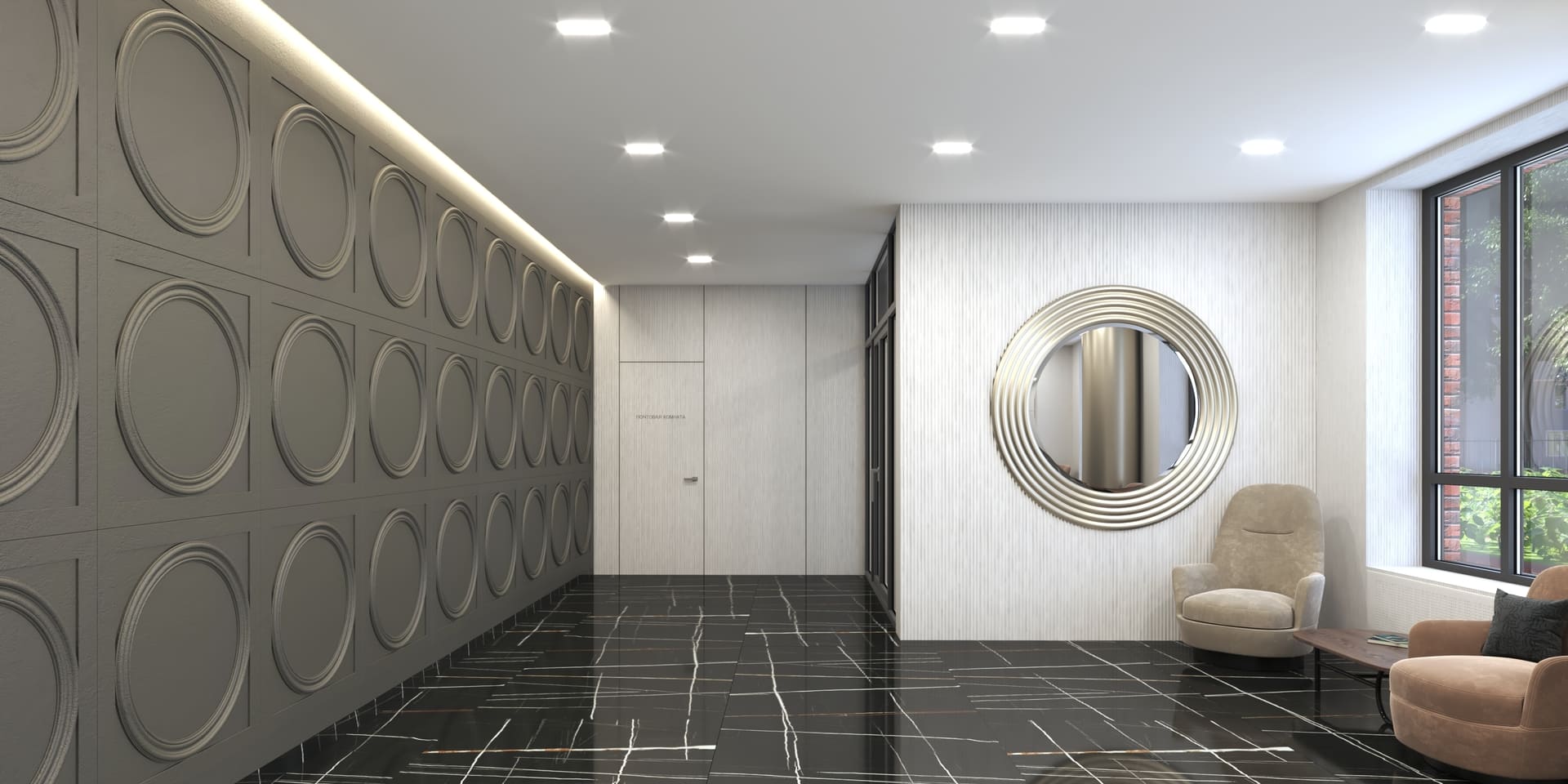 Просторные холлы с высокими потолками, витражными окнами и элегантной отделкой создают ощущение легкости и воздушности. Здесь используется крупноформатный керамогранит, декоративные панели и зеркала, а мягкая мебель в зоне ожидания добавляет уют.