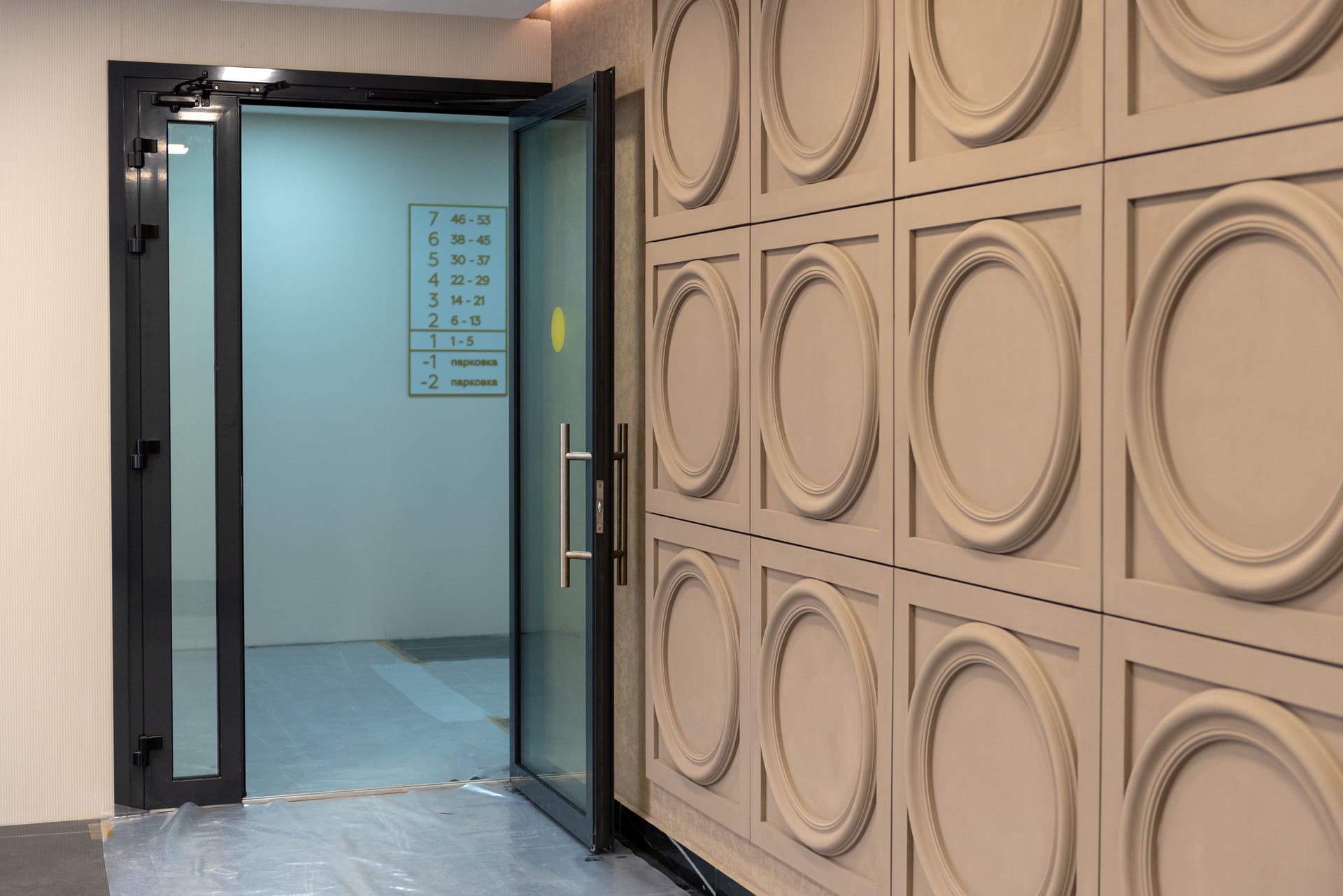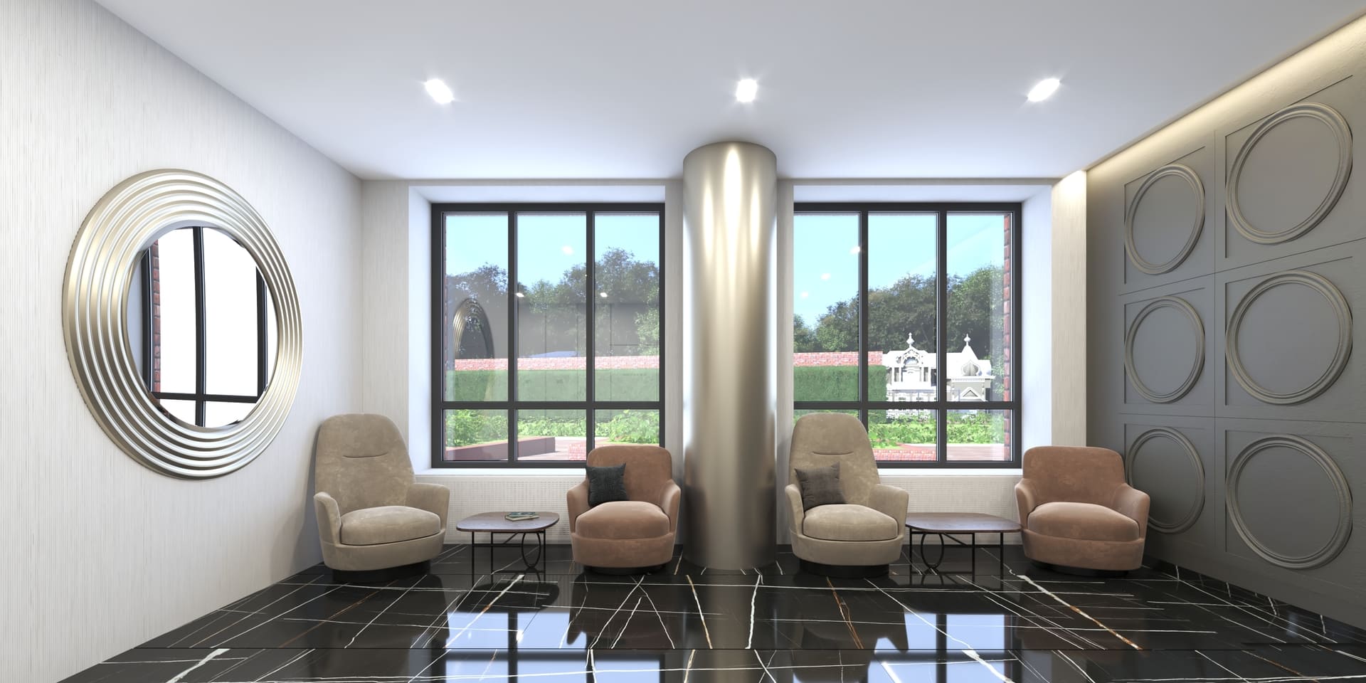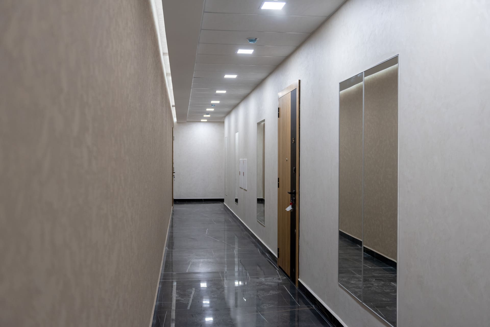 Просторные холлы с высокими потолками, витражными окнами и элегантной отделкой создают ощущение легкости и воздушности. Здесь используется крупноформатный керамогранит, декоративные панели и зеркала, а мягкая мебель в зоне ожидания добавляет уют.