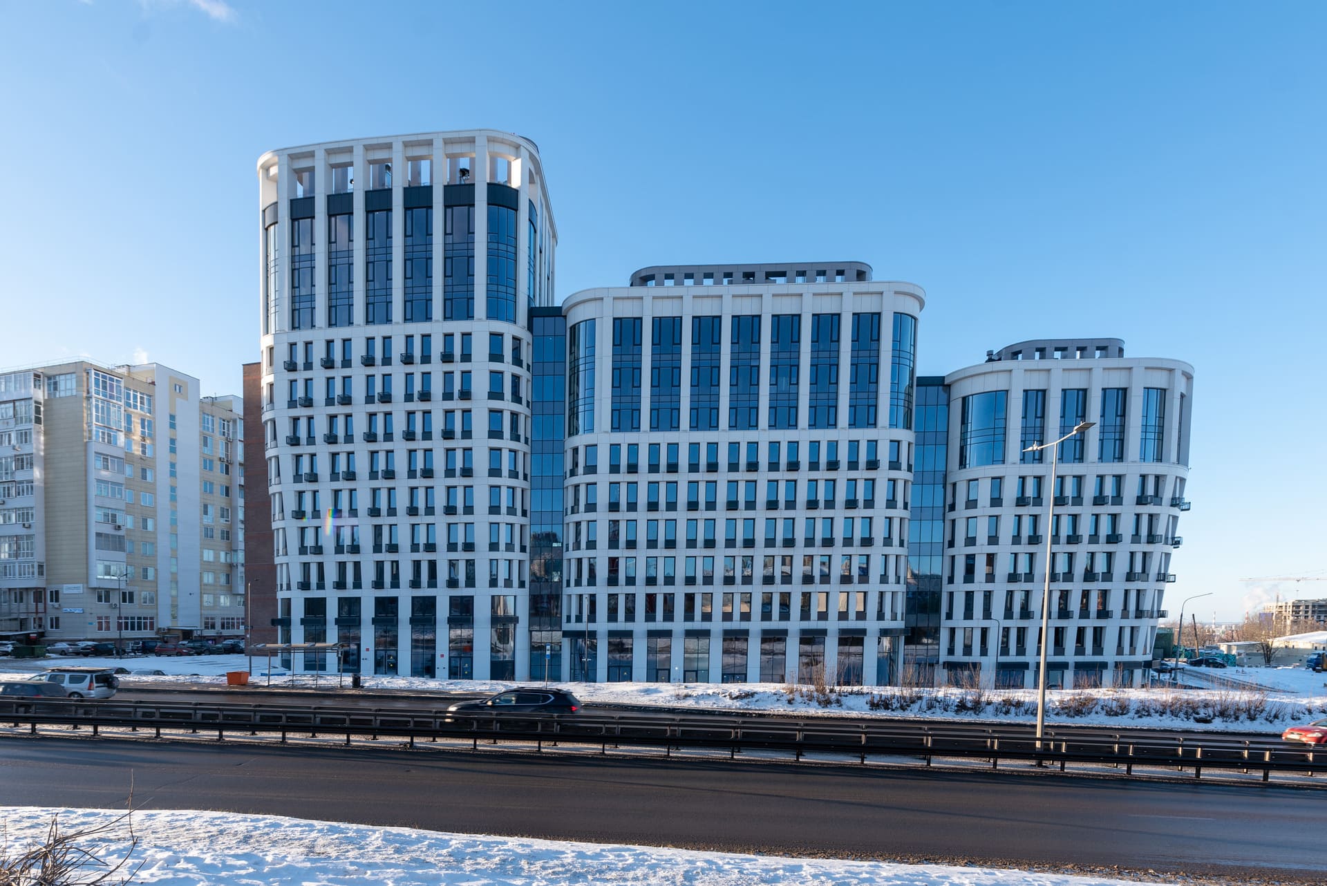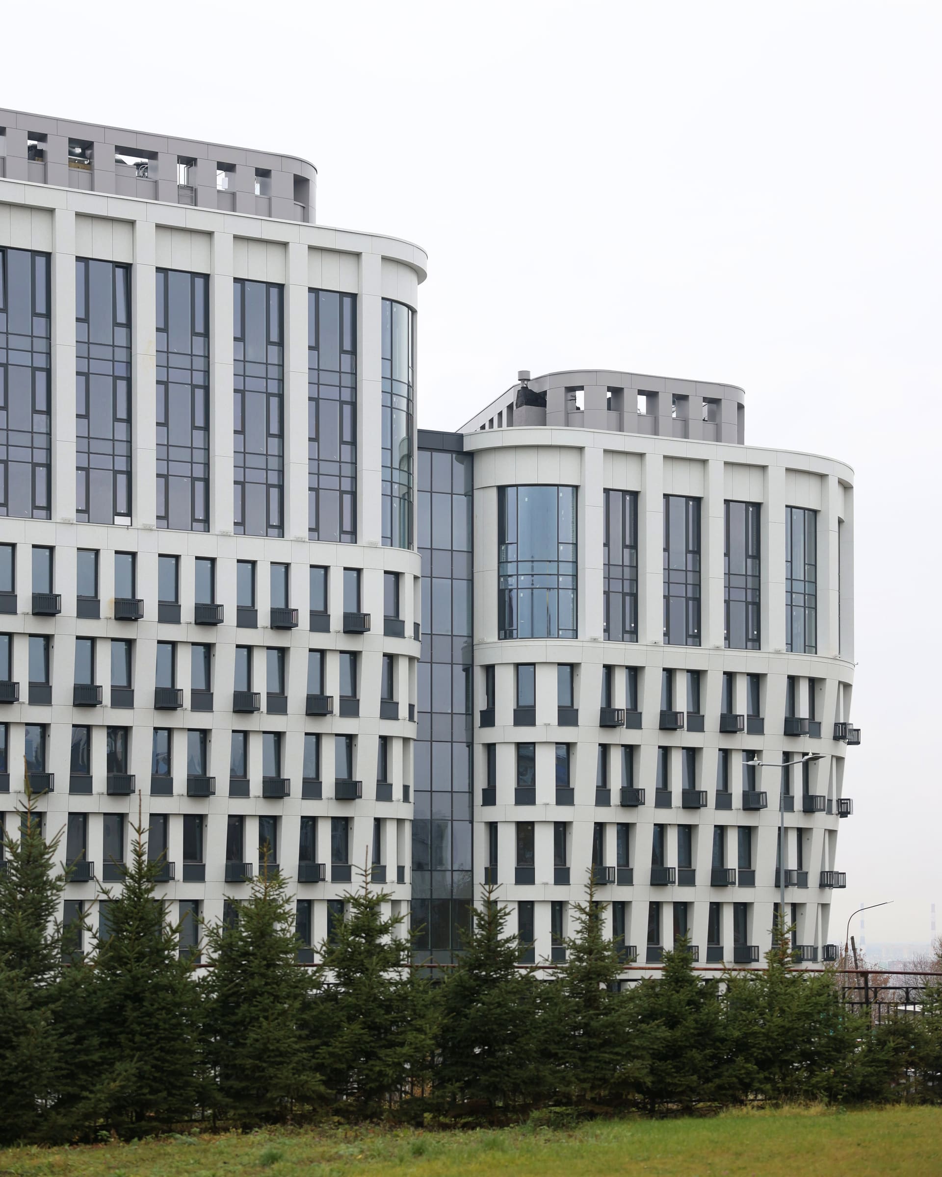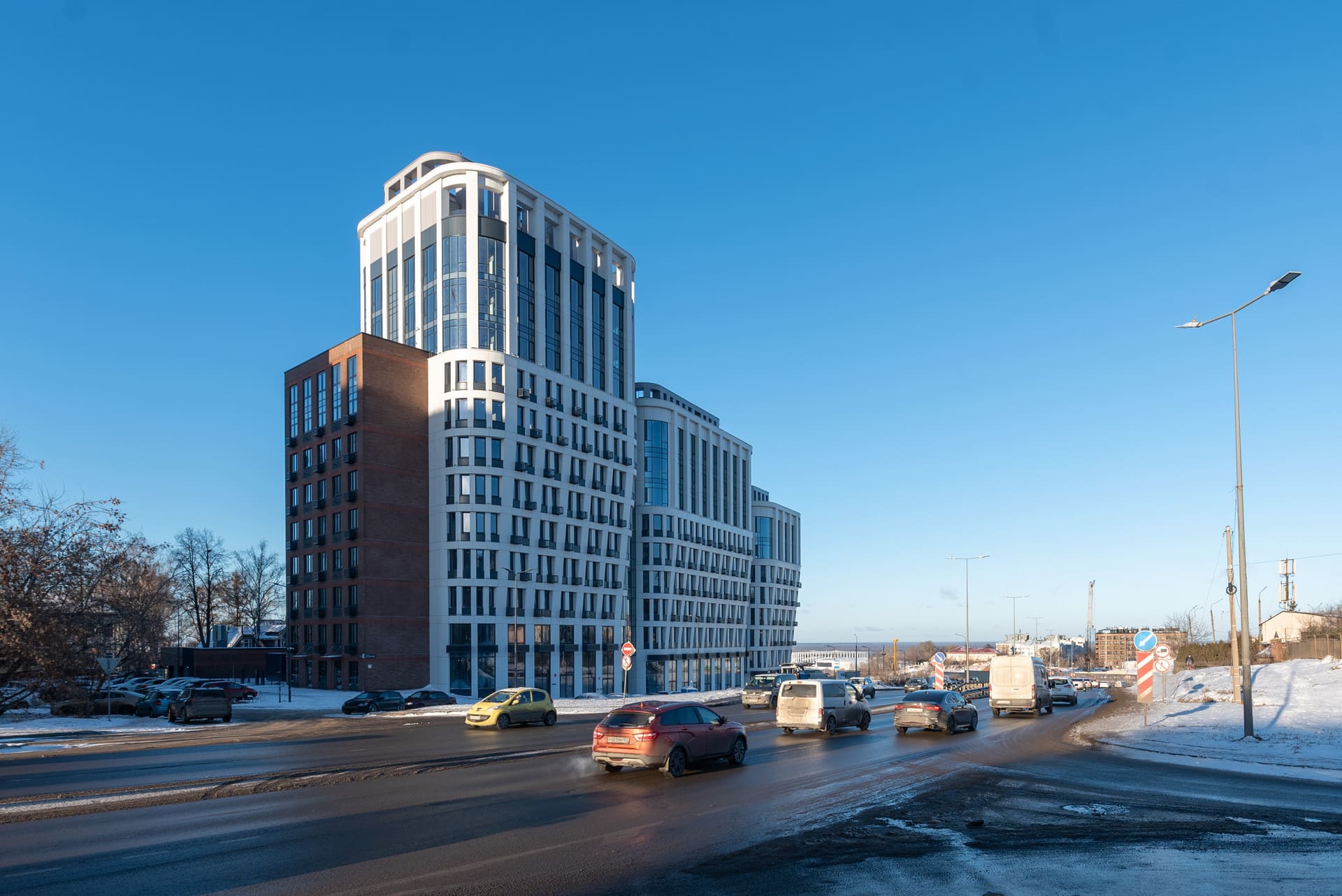 Сложная конструктивная форма дома в виде чаши придает ему незабываемые очертания. Разноэтаэжные секции, витражное остекление, многообразие текстурных отделочных материалов – все это делает КМ Дом на Барминской таким невероятным.