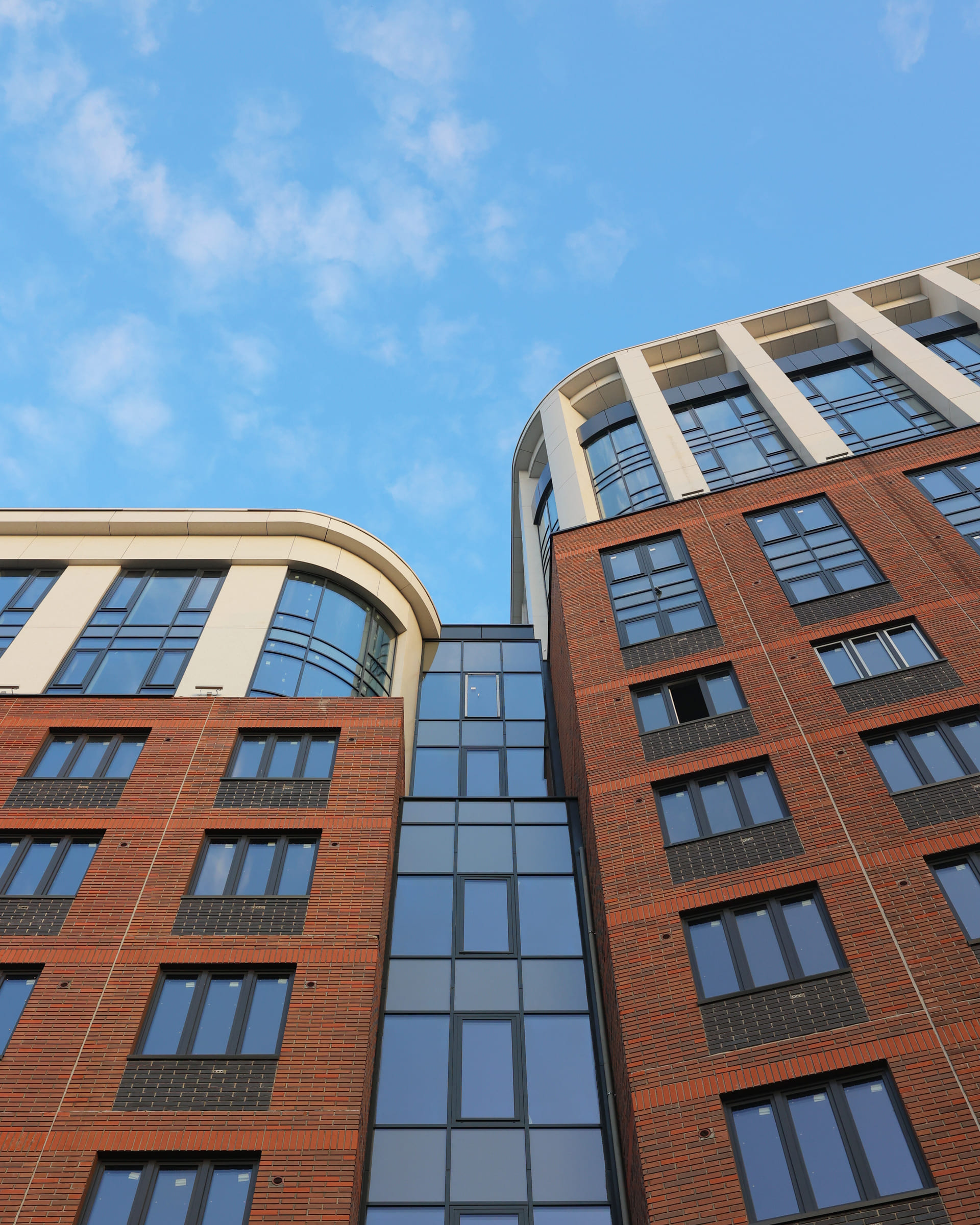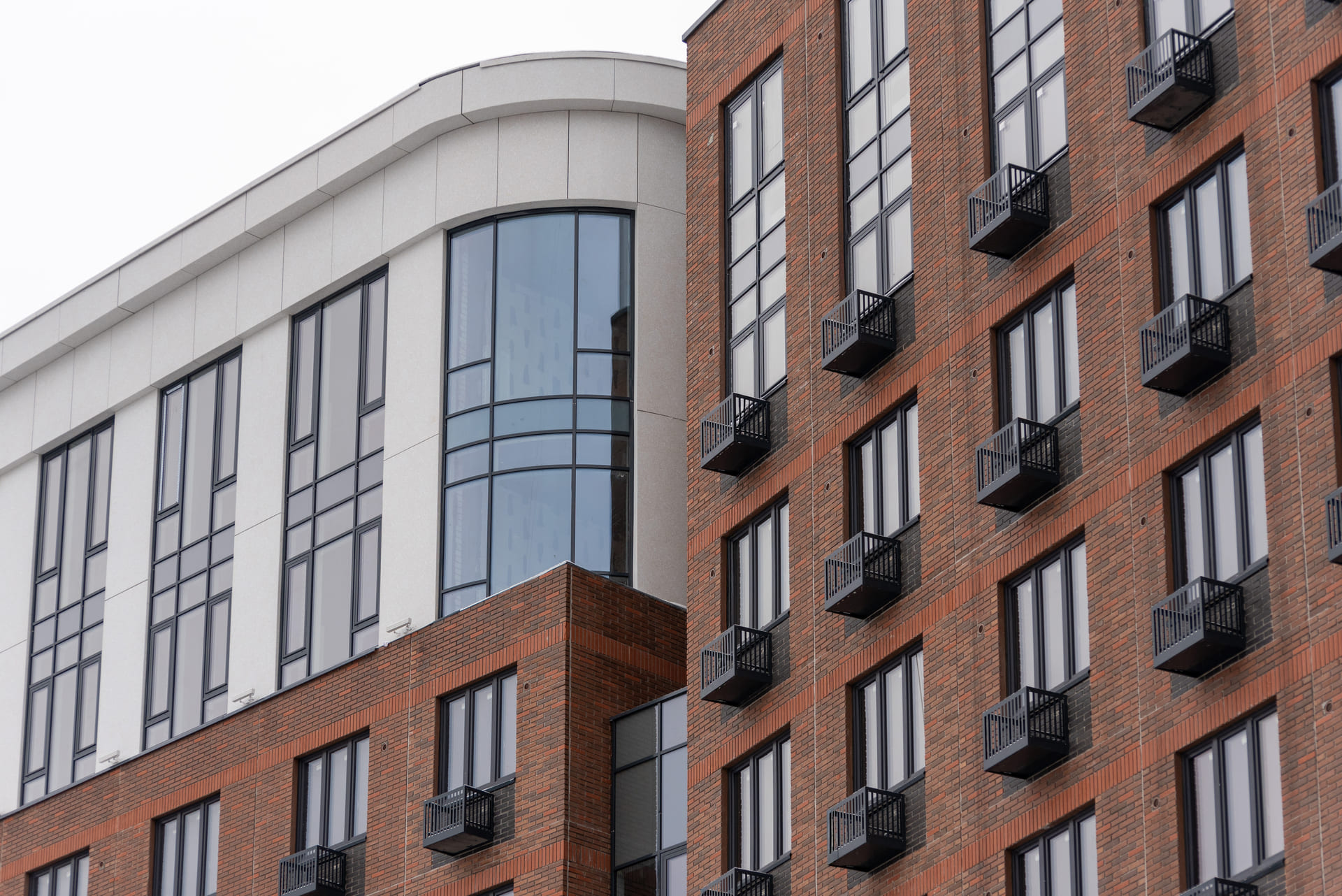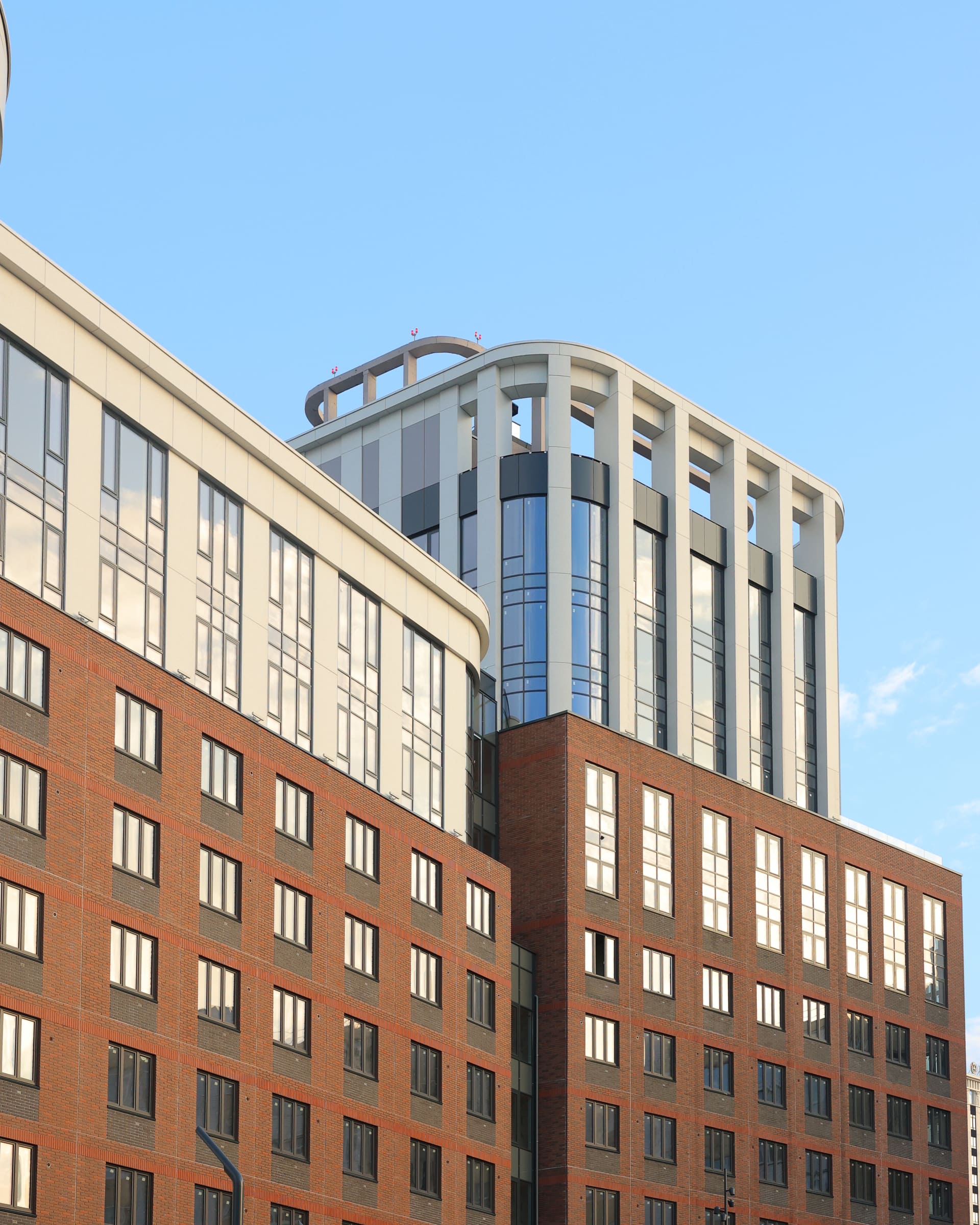 Фасады с южной стороны и со стороны двора выполнены из многослойных бетонных панелей, произведенных на собственном заводе КМ Precast и облицованных прочным клинкерным кирпичом. Вентилируемый фасад наружных стен с северной стороны и со стороны улицы Одесская выполнен из крупноформатного алюминиевого композитного материала с текстурой камня.