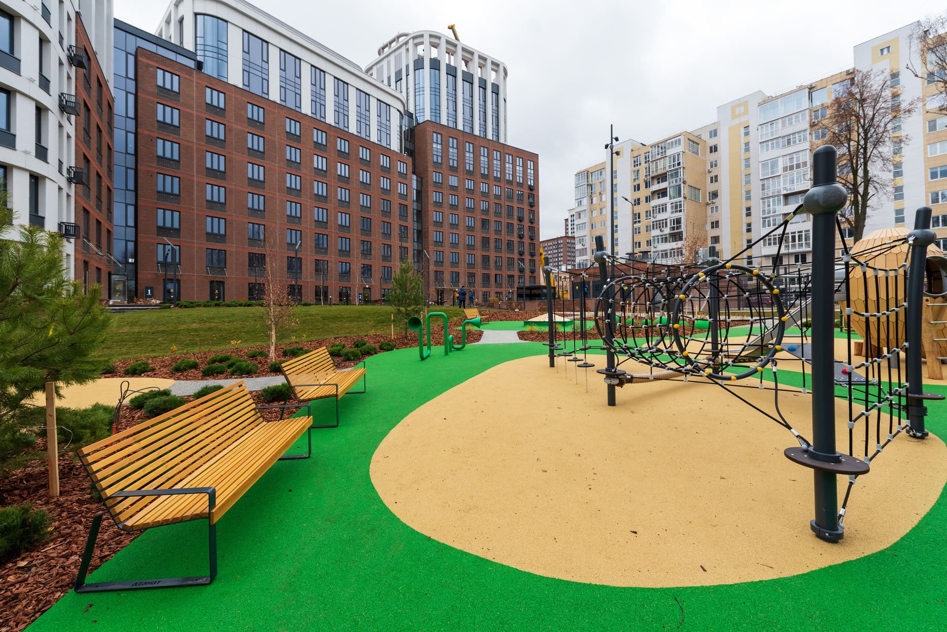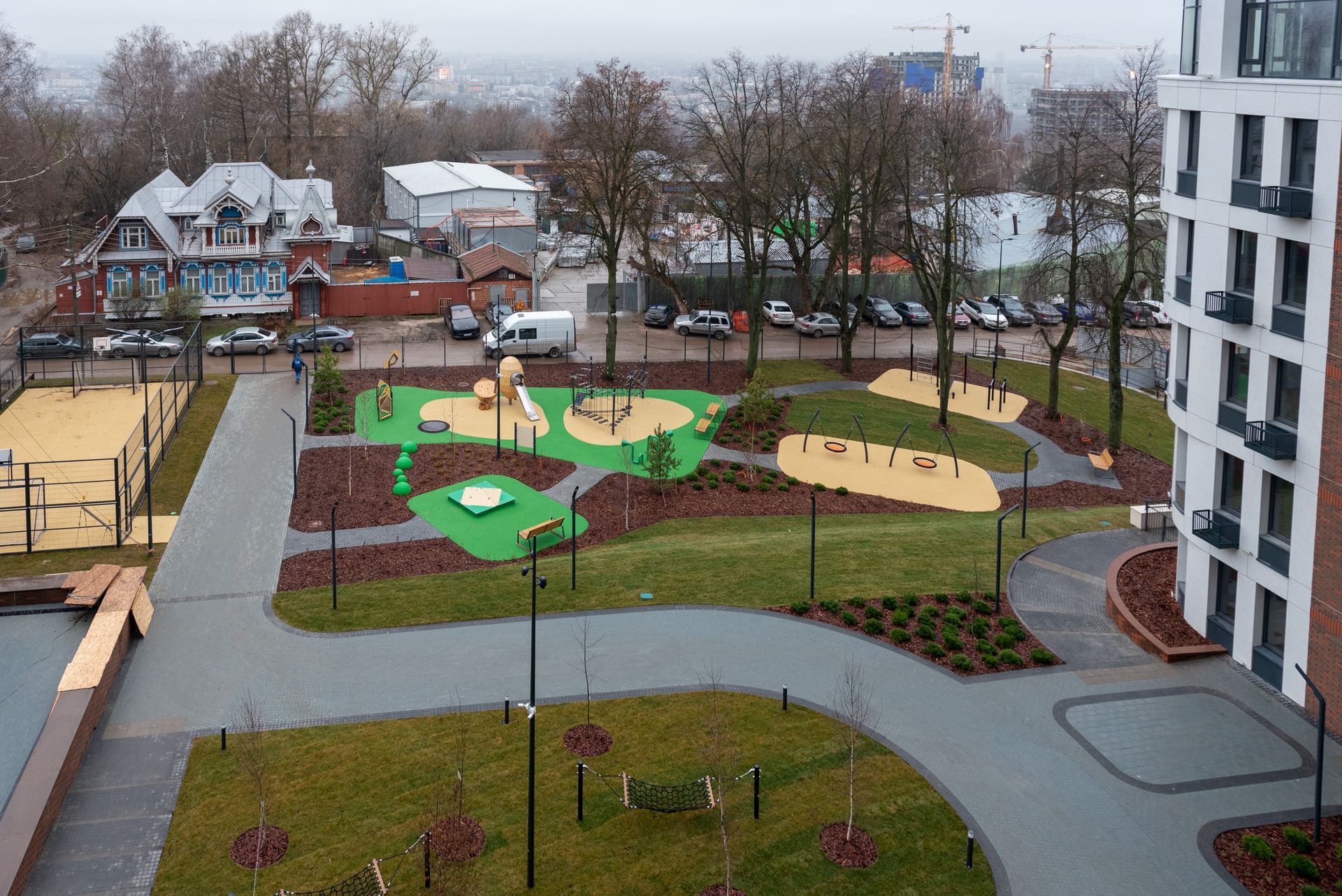 Современные площадки, воркаут, спортивное поле, качели и гамаки создают атмосферу жизни и движения.